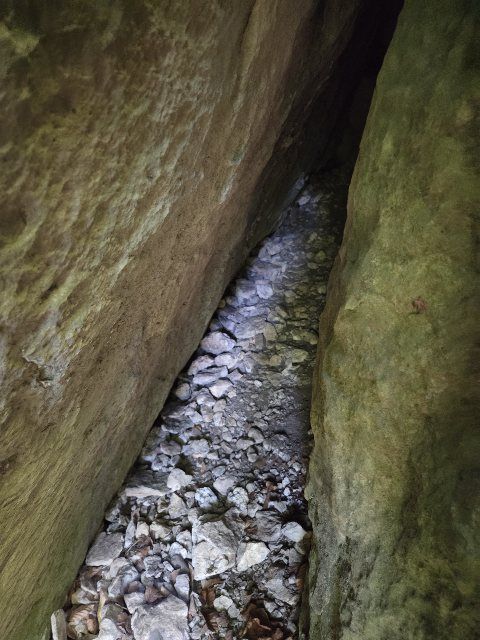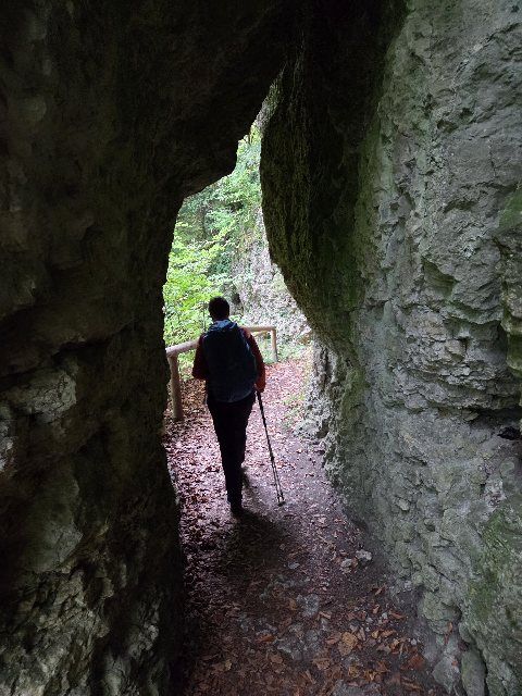 Wir kommen zur etwas abseits den Hang hoch gelegenen Zwergenhöhle, die sowohl von der Höhe als auch von der Breite nicht für Erwachsene geschaffen ist.