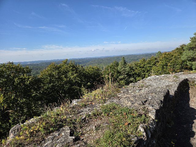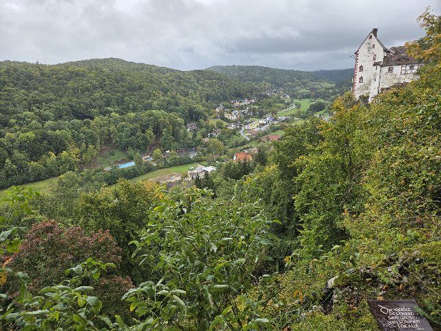Wir gehen den insgesamt gut 1 km langen Umweg durch den Wald zum Wilhelmsfelsen, von wo aus man einen lohnenswerten Blick auf die Burg und aufs Tal hat. Auf dem Weg finden wir riesige Walnüsse so groß wie kleine Kartoffeln (s. Erntedankfestbild), um die sich niemand zu kümmern scheint, die jedoch bereits sehr gut schmecken.
