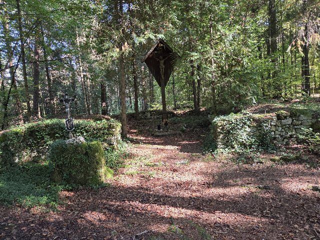 Nach der Stärkung passieren wir im Wald die wiederhergestellten Reste einer Kapelle. Daneben hat der Förster einen Aushang gemacht, wo er darum bittet, wegen der Waldbrandgefahr doch bitte keine Kerzen anzuzünden. Wörter sind von anderen, die das nicht einsehen wollen, gestrichen und er lächerlich gemacht worden. Ein Dummejungenstreich?