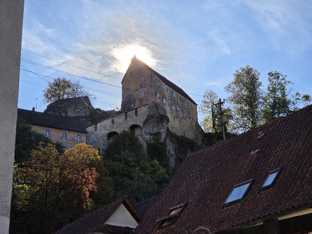 Über uns thront im Gegenlicht die Burg. Außerdem gibt es in dem Ort ein Scharfrichtermuseum.