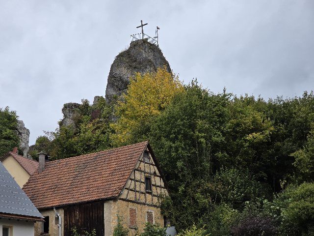Wir kommen jetzt zu einem vielfotografierten Wahrzeichen der Fränkischen Schweiz, einem sich an die Felsen schmiegenden Fachwerkhaus.