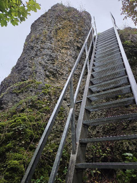 Der Weg geht mal wieder durch Wiesen und Wald. Unser erstes Zwischenziel hinter dem Dorf Hundsdorf ist der Signalstein bei Sorg, von dem man früher Signale zu anderen Punkten aussandte, wenn sich z.B. Feinde näherten. Wir gehen die steile Aluleiter hoch, was mich etwas an Überwindung kostet. Die Sicht ist mittelprächtig.