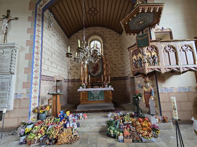 Es geht weiter über Wiesen hinauf ins idyllische Thuisbrunn durch eine Art Park. In der Kirche liegen vor dem Altar noch die Früchte der diesjährigen, reichhaltigen Ernte. Heute fand der Erntedankfestgottesdienst statt.