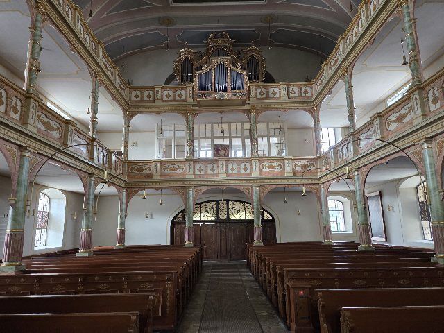 Die evangelische Kirche – hier war die Reformation schon 1529 erfolgreich – ist geöffnet, es sitzt sogar jemand drin, so dass ich mich nicht traue, ein Foto von innen zu machen. Es gibt zwei Emporen und viele Fenster, so dass die Kirche sehr hell erscheint, sie mutet italienisch renaissancehaft an, wenngleich der Altar aus der Barockzeit stammt.
