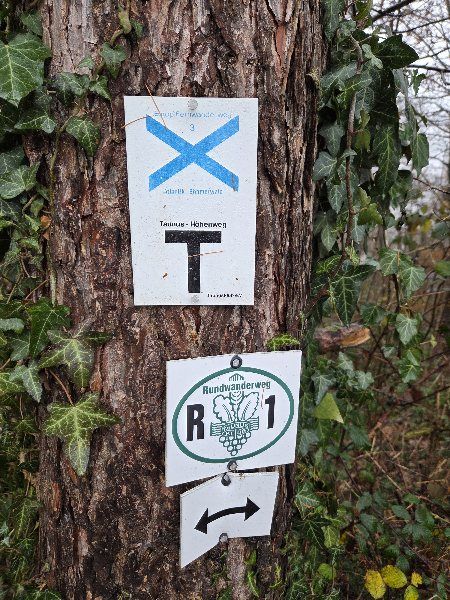 Schließlich erreiche ich Fischbach, wo wir uns vor über 25 Jahren mal ein Haus angeguckt haben, glücklicherweise haben wir es nicht gekauft, hier gibt es nicht mal eine S-Bahnstation. Allerdings liegt Fischbach am Taunushöhenweg und am Europäischen Fernwanderweg E3, denen ich nun für anderthalb Tage bis Schlangenbad folgen werde.