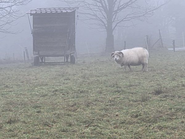 Eine einsame Kuh im Nebel beäugt mich. Wir wissen wohl beide nicht so 100%ig, was wir hier gerade so treiben.