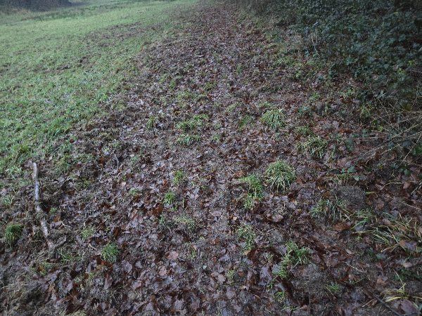 Der Dauerregen und die milden Temperaturen haben dazu geführt, dass der Weg extrem weich und matschig ist, ich kämpfe mich parallel zur Autobahn durch den Morast, in den ich tief einsinke.