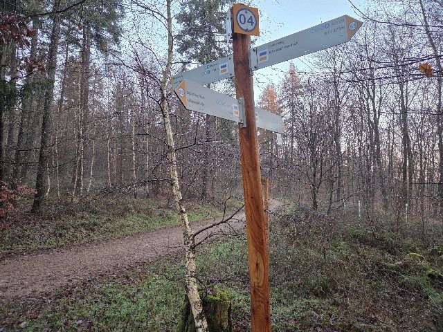 Draußen ist es knapp über null Grad und trocken, die Sonne blinzelt sogar hinter der Baumstämmen. Ich nehme den im Streichen verlaufenden Chaisenweg, der mich am Ende hinauf zum Kellerskopf (474 m) führt. Hier wird ein aus Holland stammendes Wegmarkierungssystem verwandt. Jeder Wegpunkt hat eine Nummer, man läuft quasi eine Nummernfolge ab, die man sich vorher von der Karte – meine Theorie, gesehen habe ich die nicht – abgeschrieben hat. So ähnlich wie die Speisenfolge im Restaurant.