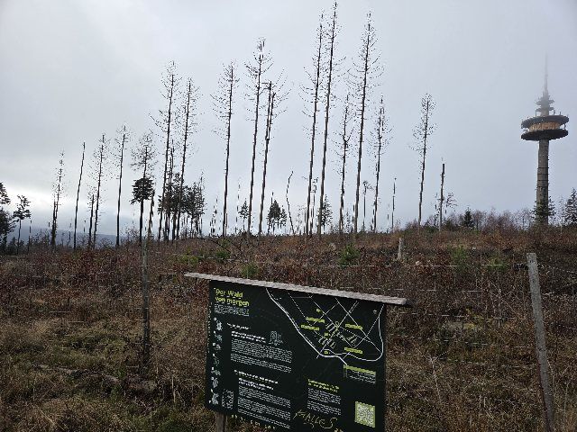 Das Dach der heutigen Etappe ist die Hohe Wurzel auf 618 m. Hier sieht es schlimm aus. Vom Fichtenbestand ist nichts geblieben, die Trockenheit in den Jahren 2018-2022 hat zu einer explosionsartigen Vermehrung des Borkenkäfers geführt, der von den Bäumen nicht viel übrig gelassen hat.