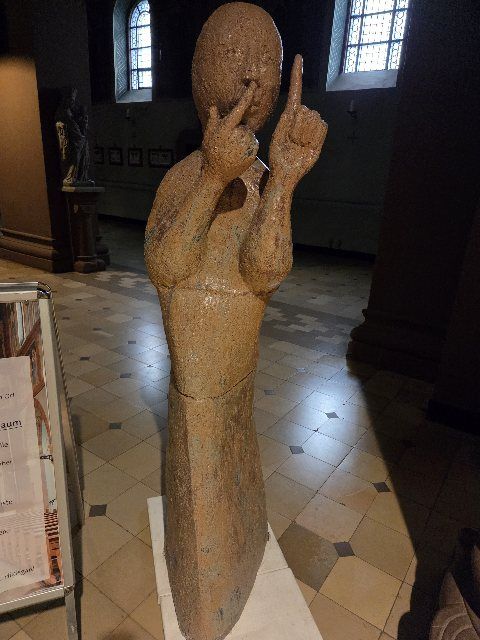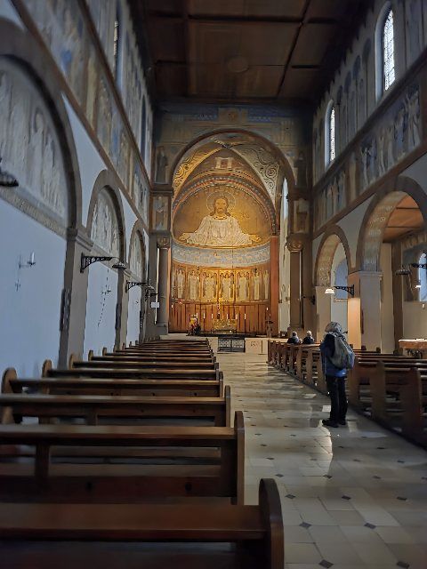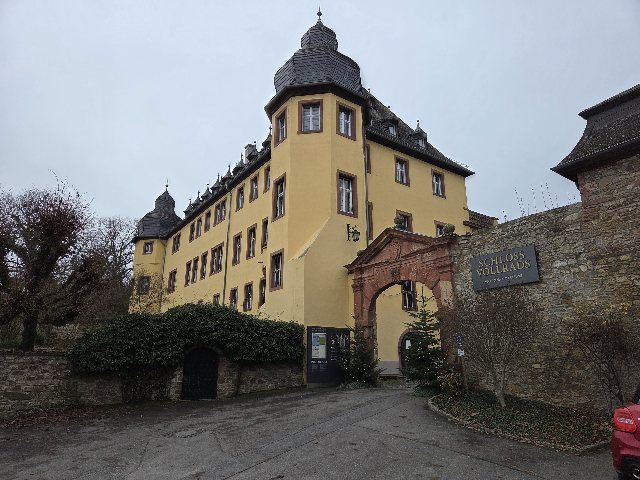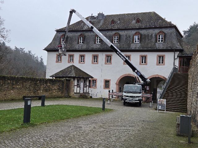 Draußen setze ich mich auf eine Bank an der Klostermauer und genieße mein deliziöses Frikadellenbrötchen vom Metzger in Kiedrich. Dabei beobachte ich einen Handwerker, der ganz alleine den Kran seines Kranwagens steuert und in der kleinen, quadratischen Stehkabine das Dach des Eingangsgebäudes gewissenhaft von oben von allen Seiten inspiziert. Ich frage mich, ob man das nicht einfacher mit einer Drohne machen könnte. Denn er scheint z.B. nicht die Regenrinnen zu säubern.