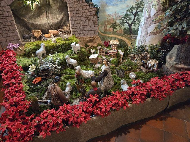 Plötzlich geht es rechts fast weglos steil den Waldabhang hinab. Ich komme im Kloster Marienthal an, wo draußen Sitzbänke stehen für eventuelle Feldgottesdienste. In der Kirche fällt eine sehr liebevoll arrangierte Krippenlandschaft auf, die unter dem Thema Wasser steht. Es bewegt sich ein bei jeder Umdrehung schnarrendes Mühlrad, das Wasser fließt über eine Leitung zur Viehtränke und ergießt sich über mehrere flache Steine.