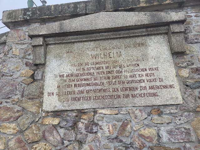 Ich gehe nun hinauf in Richtung des Niederwalddenkmals mit der passenderweise im Nebel verschwimmenden Germania. Die Inschrift von Wilhelm I., insbes. der letzte Teil, in dem künftige Geschlechter indirekt zur Nacheiferung der „Heldentaten“ des Krieges von 1870/71 aufgerufen werden, erscheint auch wenn er das natürlich 1877 nicht ahnen konnte, angesichts von zwei Weltkriegen mit vielen Millionen von Toten, die Deutschland später (mit) vom Zaun gebrochen hat, als nachgerade zynisch-prophetisch und man fragt sich schon, ob das hier noch so hingehört. Während der Denkmalseröffnung 1883 wurde übrigens auf Wilhelm I. ein Attentat von Anarchisten verübt, das fehlschlug.