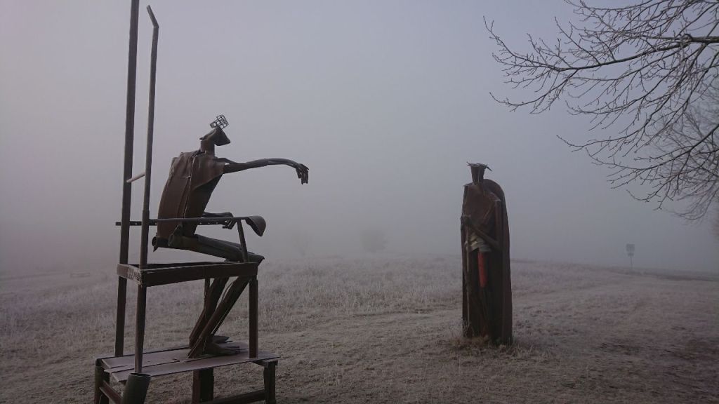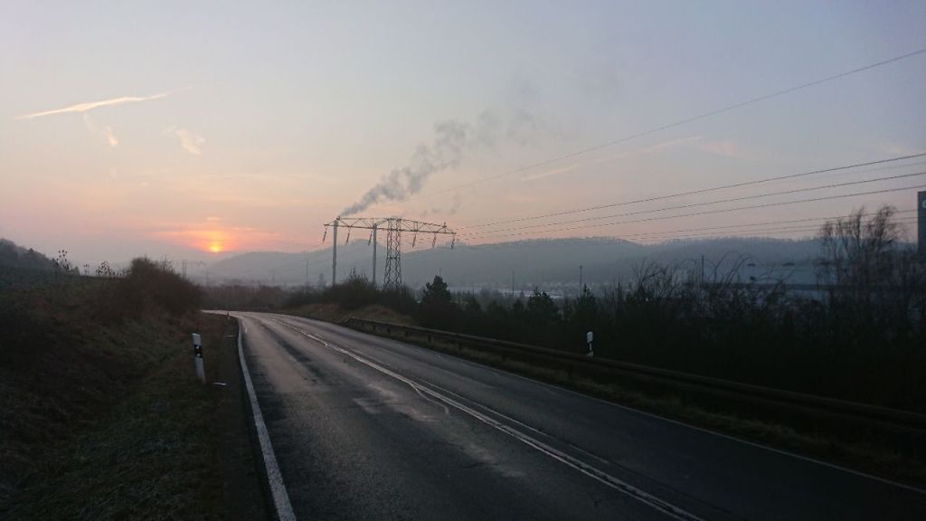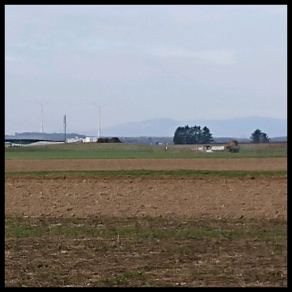 Draußen erwarten mich die ersten Schneeflocken, die Temperaturen um null Grad, der Weg glatt. Es geht über einen Höhenzug, um Windräder herum, die stehen. Ich genieße die Morgenstimmung, bin erstmals schon um 8 los, fühle mich leicht. Die erste Stunde am Morgen ist immer die Beste, ich gehe wie in Trance, durch den Kopf läuft das Gedankenkarussell. Ich freue mich darüber, dass erstmal kaum Orte am Weg sind, ich ganz allein in der Natur sein darf. Ich komme durch ein verschlafenes Dorf, wo ich einige Gedanken notiere.
