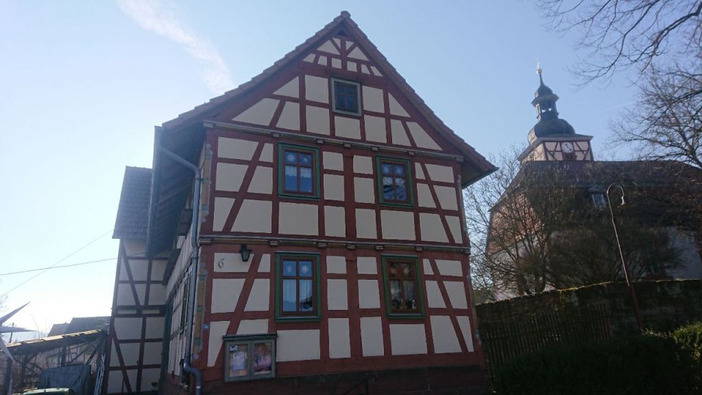 Ich erreiche nun Wächtersbach, dass ich einmal komplett durchquere. In der 2. Hälfte liegt die Altstadt mit Schloss und Fachwerkhäusern. Die evangelische Kirche ist zu.