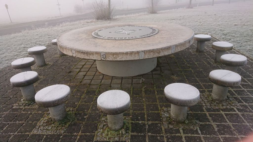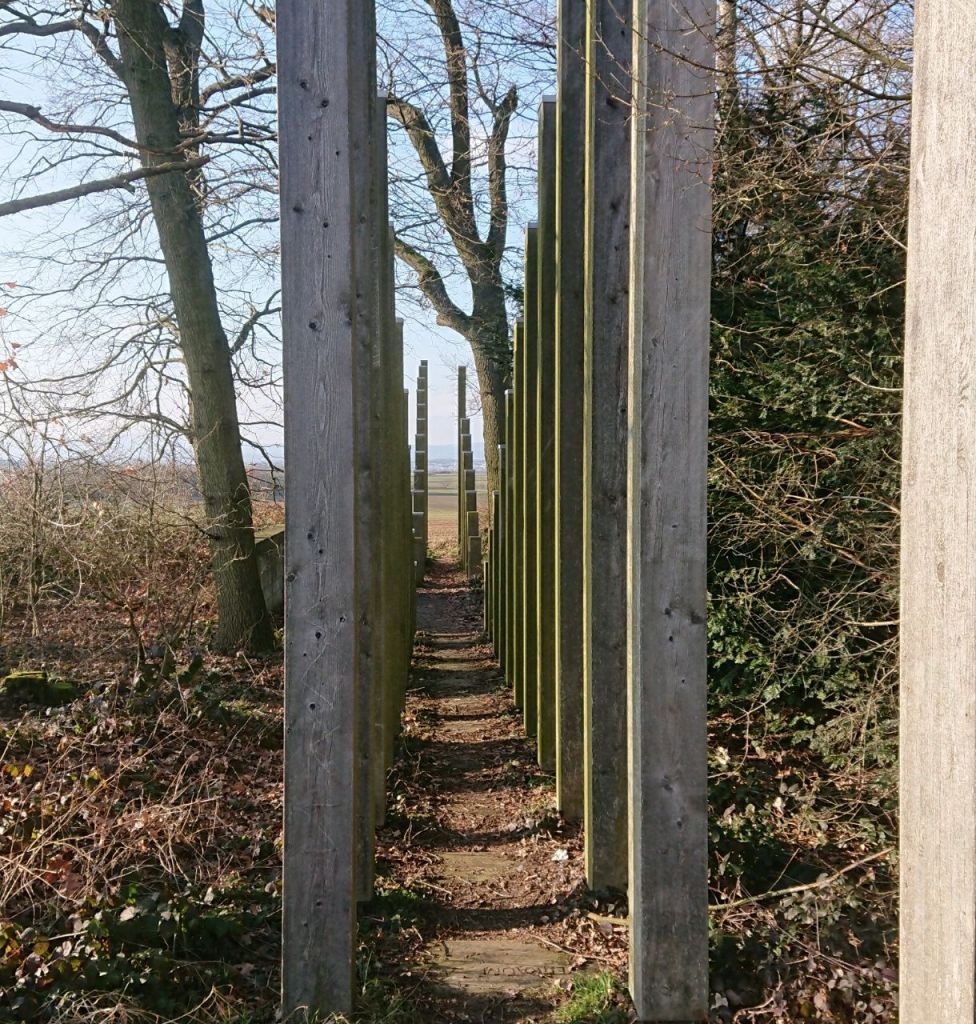 Ich erreiche die Hohe Lohe, wo recht sinnbefreit und mit Amtsdeutsch verbrämt zwei Stelenreihen aus Beton hingepflanzt worden sind.
