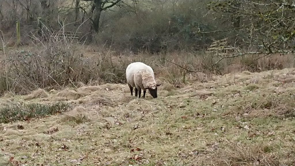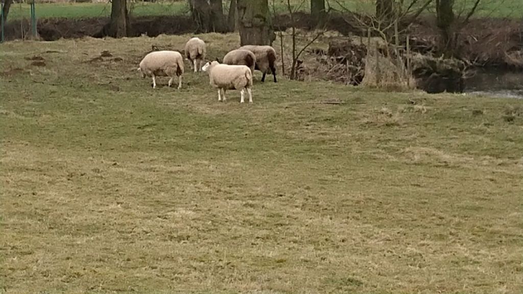 Now for something else. Ich gehe an der Salz (!) entlang raus aus Bad Soden, verpasse in Gedanken einen Abzweig nach Salmünster und gehe dann einen Forstweg hoch zu einem sich drehenden (!) Windrad hin. Nun geht es hinunter und was sehe ich links von mir? Ein Schaf, das für mich auf den 1. Blick aussieht wie ein Rhönschaf. Auf den 2. dann doch nicht, es hat schwarze Beine.