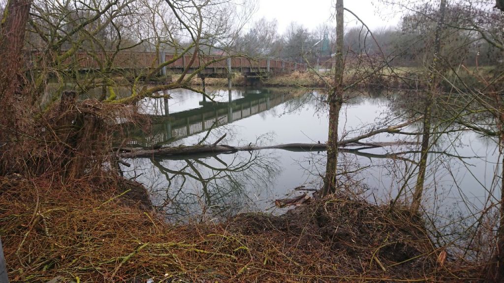 Aus dem Ort heraus gehend, komme ich schnell zur Kinzig, der ich flussabwärts folge. Ich komme auf den Radweg nach Bad Soden. Er geht schnurgeradeaus und ist asphaltiert, ist also nicht sehr schön zu gehen, aber ich komme flott vorwärts. Hier fängt es an, ein bisschen zu hageln. Rechts neben mir sehe ich seltsam verlaufende und versickernde Wasserläufe, es handelt sich um den Anfang der Kinzigtalsperre. Nach einer Weile sehe ich eine lustige Holzkapsel vor mir, in die man hineinsteigen kann. Drinnen gibt es ein Fernglas, mit dem man die verschiedenen Entenarten beobachten kann. Leider ist diese Station fehlkonstruiert. Die Bank ist zu weit vom Fernglas entfernt, so dass man nicht gleichzeitig sitzen und gucken kann. Ich muss mich fast hinhocken, um das schwere Fernglas in eine Position zu bekommen, so dass ich die Enten sehe. Da wurden mal wieder öffentliche Gelder nicht optimal eingesetzt.