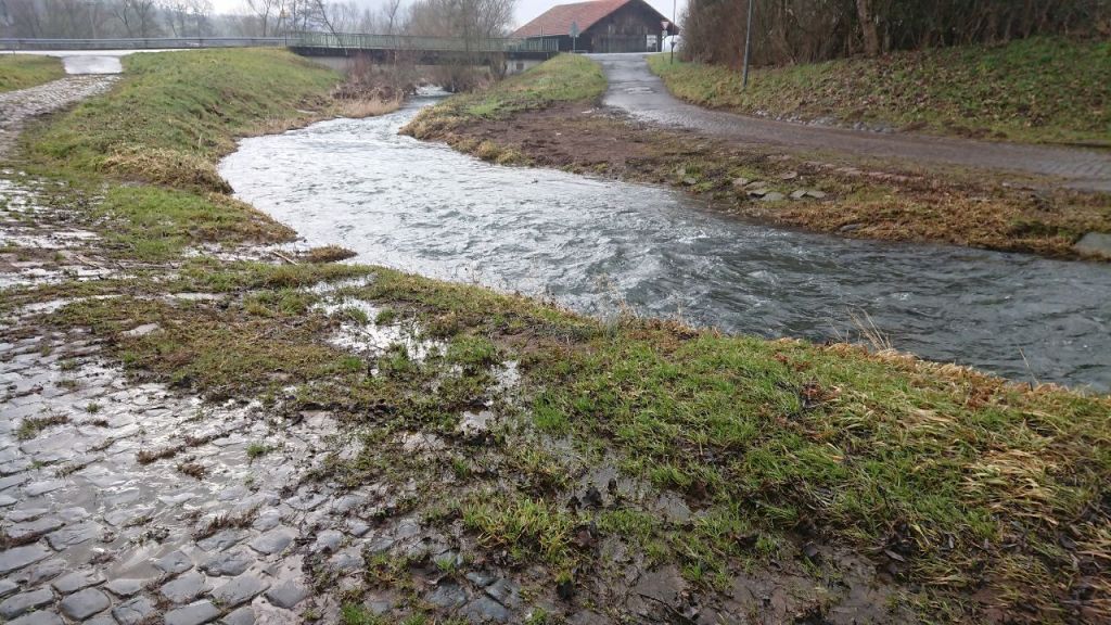 Auf einem Schotterweg, der bald geteert werden wird – mir kommt auch schon ein Raupenfahrzeug entgegen – gehe ich an der Kinzig entlang und überquere sie bei Niederzell. Das Wasser steht ziemlich hoch für die erste Februarhälfte. Wenn die Schneeschmelze einsetzt, wird es sicher Hochwasser geben.