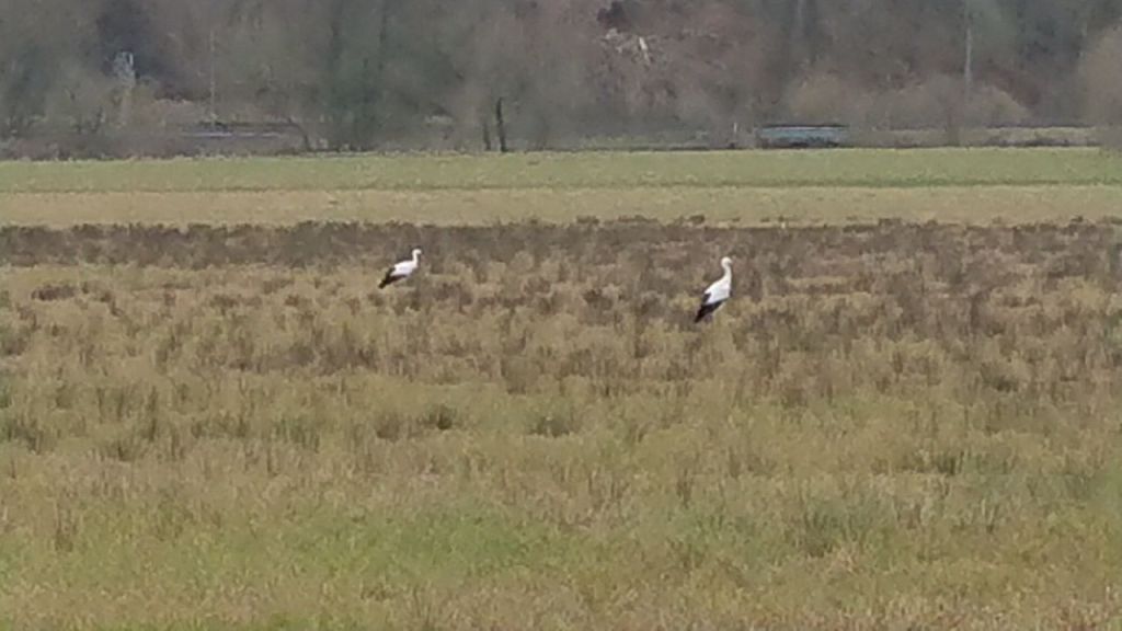 Hinaus geht es über Ausfallstraßen und ein Gewerbegebiet, das Muster wiederholt sich. Ich bin trotzdem bester Dinge, quietschfidel, die Füße fliegen nur so dahin. Ich laufe nun rechts der Autobahn, deren Rauschen mich nicht stört, ich höre ein hochinteressantes Interview mit der Schriftstellerin Rachel Cusk und ihrem Mann. Rechts von mir ist eine überschwemmte Wiese, auf der ich plötzlich zwei dahinstaksende Störche entdecke. Dem Vorderen bin ich schon zu nah und er entschwebt bald nach weiter hinten.