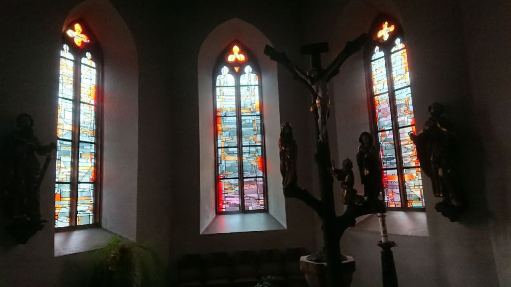 Die Inneneinrichtung der Kirche ist sehr einfach, das Buntglasfenster mit dem auferstehenden Jesus ist ein Blickfang.