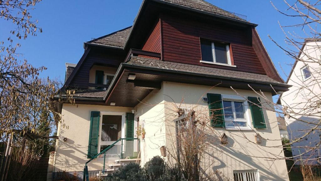 Der Weg zieht sich nun ein wenig und ich komme in Bergen an, wo ich ein Stück auf einem höhergelegenen Pfad hinter Buschwerk, das die Sicht nach Frankfurt verschleiert, gehe. Hier mache ich einen winzigen Abstecher zum unspektakulären Stadtschreiberhaus, wo die Rollos runter sind. Der bzw. die aktuell hier residierende Literat(in) scheint gerade nicht da zu sein.
